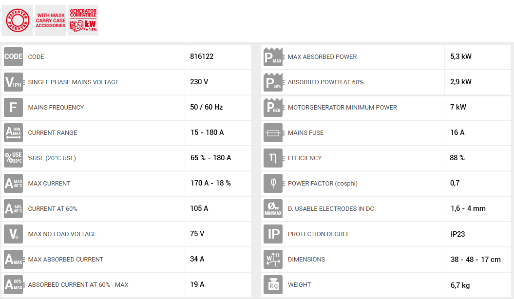 • Ηλεκτροσυγκόλληση υψηλής αξιοπιστίας με ηλεκτρονικά συστήματα 3ης γενιάς(IGBT)• Μειωμένο βάρος και διαστάσεις• Χαμηλή κατανάλωση ρεύματος (ενεργειακή).• Ομαλό και εύκολο ξεκίνημα του τόξου.• Συγκόλλησης υψηλής σταθερότητας , παρά τις διακυμάνσεις τάσης δικτύου.• Τα συστήματα Arc Force, Hot Start, Anti-Stick ανήκουν πλέον στο βασικό εξοπλισμό της οικογενείας TELWIN.• Αrc Force: Αυτόματο καλιμπράρισμα ρεύματος κατά τη διάρκεια της κόλλησης. • Hot Start: Εμποδίζει το σβήσιμο της φλόγας όταν το ηλεκτρόδιο βρίσκεται σε επαφή με το αντικείμενο κόλλησης.• Αnti-Stick: Εμποδίζει το κόλλημα του ηλεκτρόδιου με το σημείο κόλλησης.• Χάρη στην υψηλή ποιότητα παραγωγής ρεύματος (Low Distortion Quality System) έχει την δυνατότητα κόλλησης ηλεκτροδίου μέχρι 2.5mm. •Θερμοστατική.• Προστασία υπέρτασης-υπότασης , προστασία υπερέντασης.• Προστασία γεννήτριας (± 15%).• Δυνατότητα χρήσης των παρακάτω τύπου ηλεκτρόδιων : ρουτιλίου , βασικό, ανοξείδωτο, χάλυβα, μαντέμι , κλπ.• Πλήρης με MMA εξαρτήματα συγκόλλησης και πλαστική θήκη μεταφοράς.
