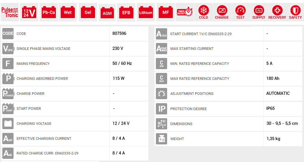 • Αυτόματη φόρτιση και συντήρηση σε λειτουργία PULSE TRONIC : Η τεχνολογία Pulse Tronic βασίζεται στην άμεση, ακριβή διάγνωση/κατάσταση και σε συνδυασμό με ειδική παρέμβαση για την αποκατάσταση και καλύτερη λειτουργία της μπαταρίας. Τα 8 στάδια φόρτισης της τεχνολογίας Pulse Tronic βασίζονται στην έξυπνη παρακολούθηση και ειδικές μορφές «κυματομορφών» (παλμούς) για τη διατήρηση της βέλτιστης φόρτισης και συντήρησης χωρίς να προκαλεί αλλοιώσεις ή τροποποιήσεις που βλάπτουν τη χημική δομή της μπαταρίας, ακόμη και σε παρατεταμένες περιόδους (π.χ. συντήρηση οχήματος σε περιόδους ακινησίας).Ο συνεχής έλεγχος της διαδικασίας φόρτισης αφενός αποτρέπει την πιθανή υπερφόρτιση και υπερθέρμανση της μπαταρίας και αφετέρου επιστρέφει την μπαταρία στην βέλτιστη κατάσταση. Το αποτέλεσμα είναι μια τέλεια φορτισμένη μπαταρία με μεγάλη διάρκεια ζωής.